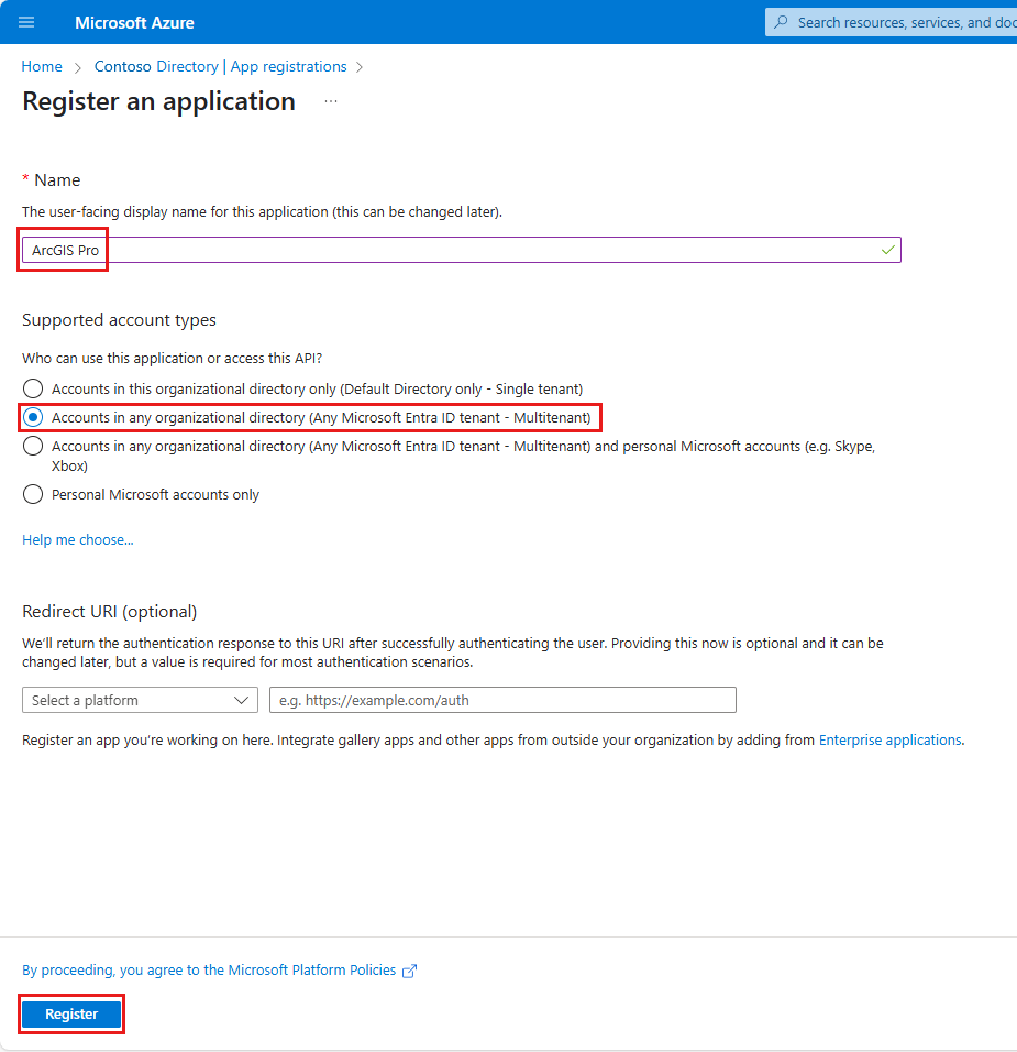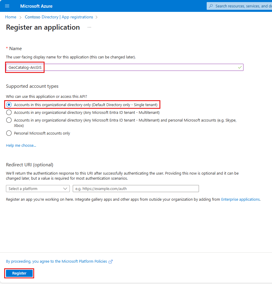 Erstellen Sie eine zweite App-Registrierung für den ArcGIS Pro-Desktopclient mit einem der folgenden vorgeschlagenen Namen: ArcGISPro-GeoCatalog-DesktopClient oder GeoCatalog-ArcGIS. Legen Sie den Kontotyp fest, indem Sie "Einzelner Mandant" auswählen.