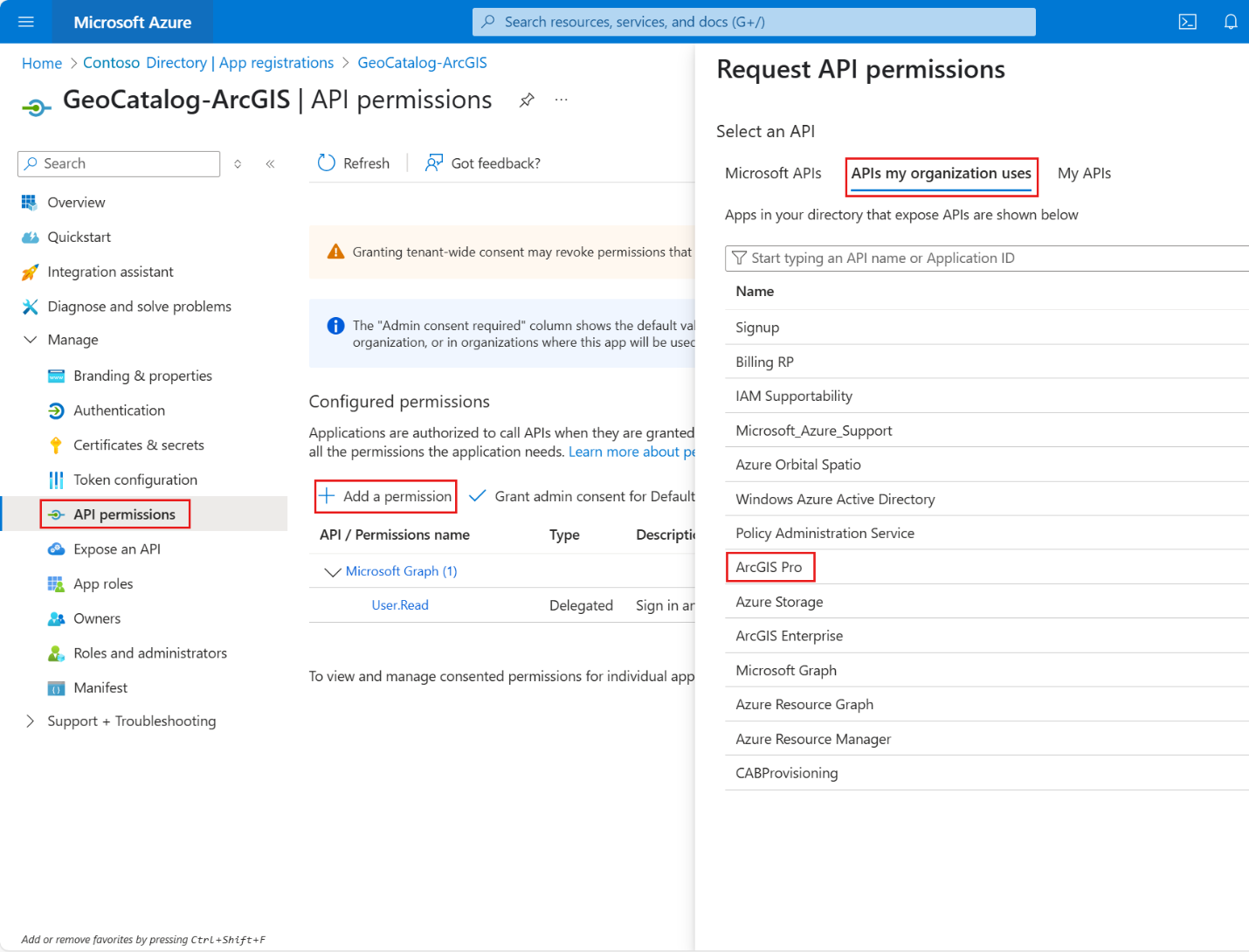 Wechseln Sie zu den APIs, die meine Organisation verwendet , und suchen Sie nach der Web-API-App , die Sie zuvor erstellt haben (z. B. ArcGIS Pro).