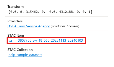 assetsin der STAC Item JSON-Spezifikation. Wählen Sie einen der Objekttypen in diesem Objekt aus, und suchen Sie denhrefSchlüssel."assets": { "image": { "href": "https://<unique-storage>.blob.core.windows.net/naip-sample-datasets-<unique-id>/12f/va_m_3807708_sw_18_060_20231113_20240103/image.tif", } }Notieren Sie den Wert für den Kontonamen und den Containernamen. Beispiel: