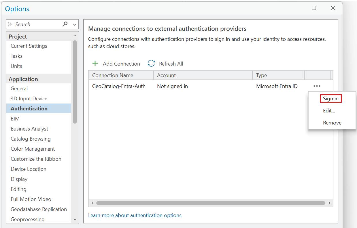 In diesem Abschnitt wird beschrieben, wie Sie die Authentifizierung und den Datenzugriff in der ArcGIS Pro-Desktopanwendung konfigurieren. Sie verwenden die OAuth 2.0-Integration mit Microsoft Entra ID und greifen auf den Microsoft Planetary Computer Pro GeoCatalog zu. Dieser Abschnitt enthält Schritte zum Hinzufügen einer Authentifizierungsverbindung und zum Erstellen von Speicher- und STAC-Datenverbindungen.