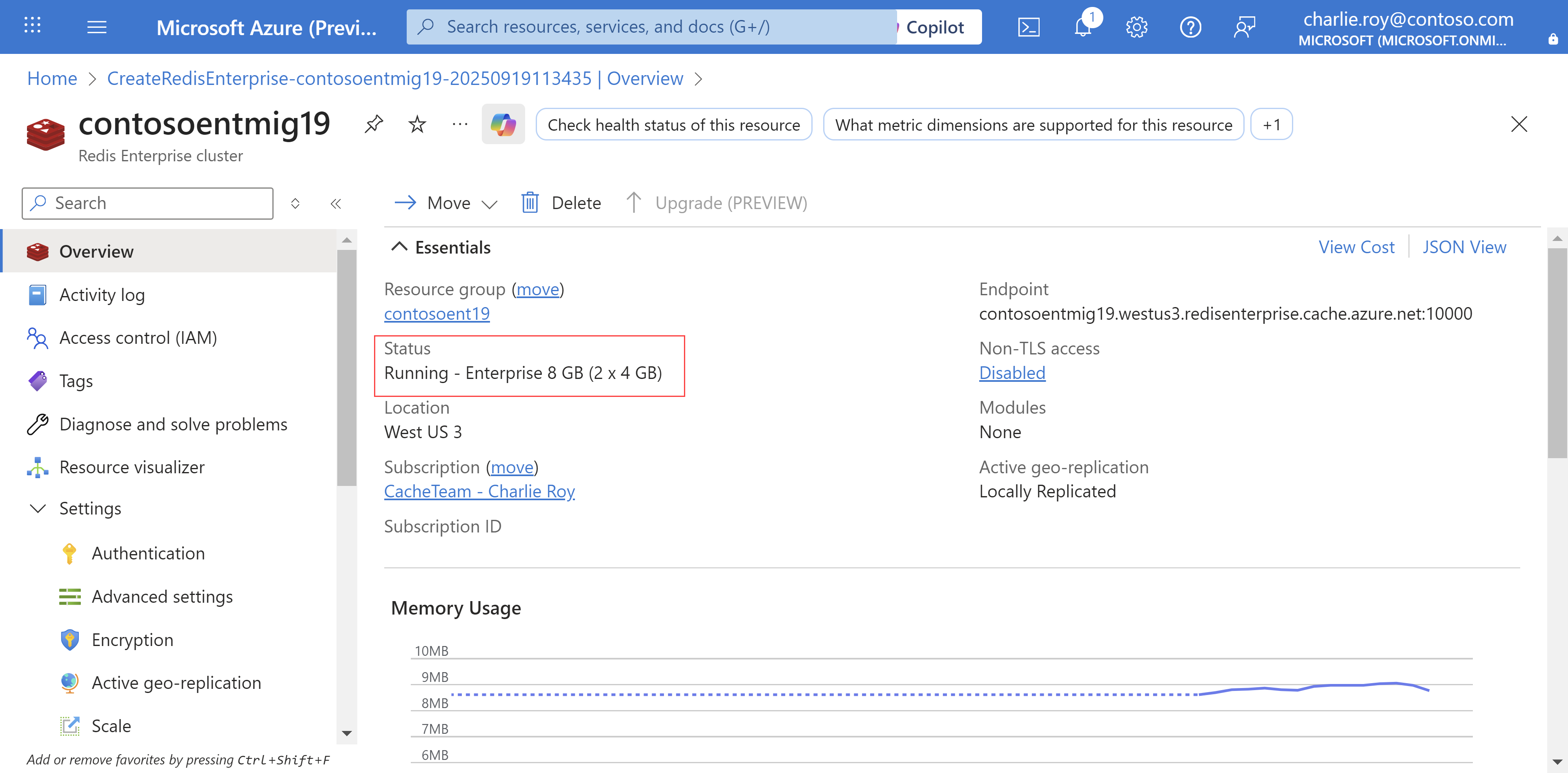 Im Bereich "Status " im Übersichtsbereich sehen Sie "Running - Enterprise 8GB (2 x 4 GB)". Diese Notation bedeutet, dass der Cache derzeit eine E5 Enterprise-SKU mit einer Skalierung von 2 verwendet, was zu einem 8-GB-Cache führt. Daher sollten Sie mit mindestens 10 GB Cache auf Azure Managed Redis beginnen.