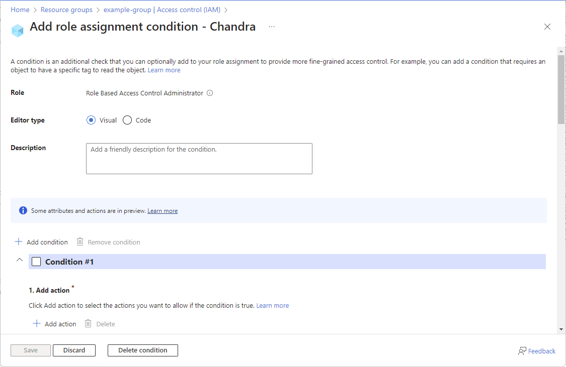 Wenn Sie das derzeit angegebene Attribut verwenden möchten, erstellen Sie die Rollenzuweisungsbedingung in einem anderen Bereich, z. B. dem Ressourcengruppenbereich. Sie können den Ausdruck auch mithilfe der aktuell ausgewählten Aktionen entfernen und erneut erstellen.