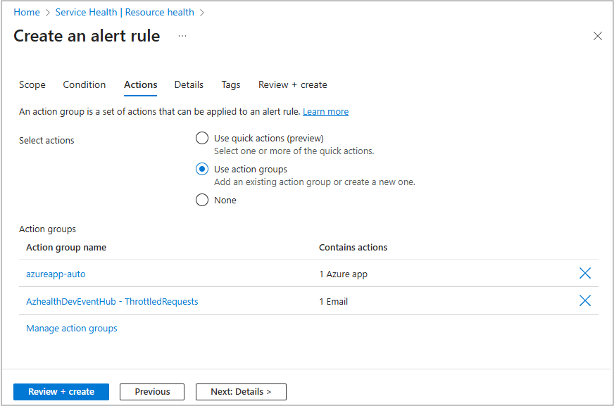 Basierend auf Ihrem Abonnement gibt es eine Liste aller verfügbaren Aktionsgruppen, die Sie auswählen können.
