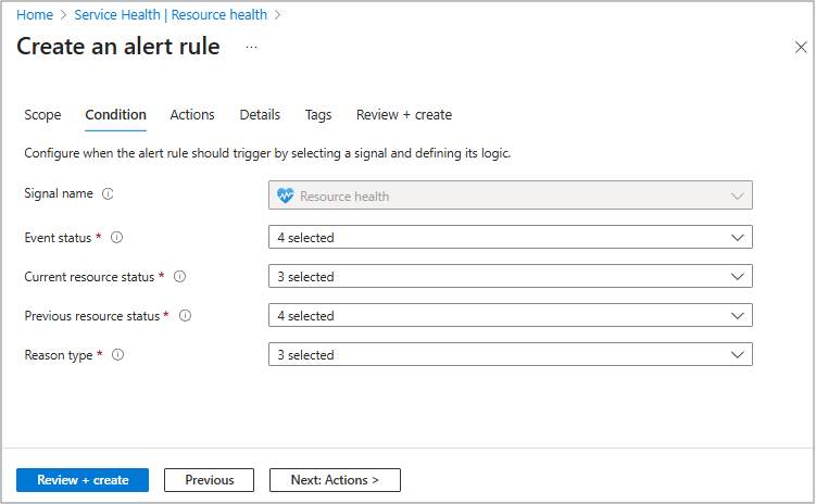 Verwenden Sie diese Registerkarte, um auszuwählen, was Sie benötigen, um Ihre Warnung auszulösen. Sie können ihn so konfigurieren, dass Änderungen im Resource-Health-Status (z. B. „Nicht verfügbar“ oder „Heruntergestuft“), im Ereignisstatus (z. B. „Aktiv“ oder „Behoben“) oder sogar bei bestimmten Grundtypen (Plattformaktionen vs. Benutzeraktionen) überwacht werden.