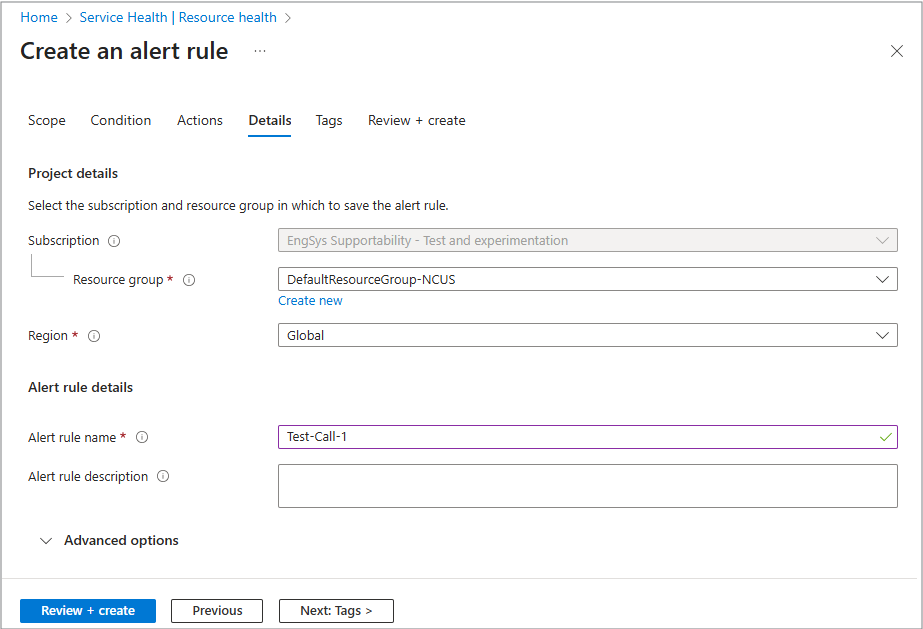 Verwenden Sie zum Einrichten Der Warnung die sechs Registerkarten in diesem Fenster: Bereich, Bedingung, Aktionen, Details, Tags und Überprüfen + erstellen.