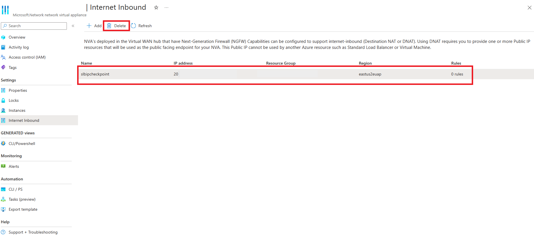 - Option zum Zuordnen von IP zur NVA-Ressource, die nicht über das Azure-Portal verfügbar ist: Nur NVAs, die mit DNAT/Interneteingangs-IPs zur Bereitstellungszeit erstellt werden, sind berechtigt, DNAT-Funktionen zu verwenden. Löschen Sie das NVA, und erstellen Sie es neu mit einer zum Zeitpunkt der Bereitstellung zugewiesenen IP-Adresse für eingehende Internetverbindung.