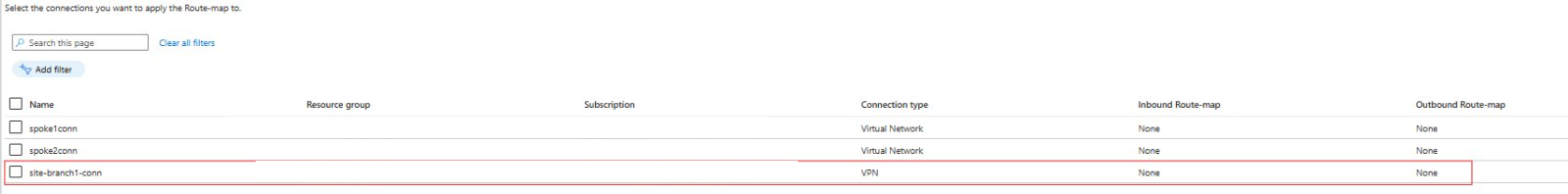 - In der Tabelle unten sind alle Verbindungen mit dem virtuellen Hub aufgeführt. Wählen Sie eine oder mehrere Verbindungen aus, auf die Sie die Routenzuordnungen anwenden möchten.
