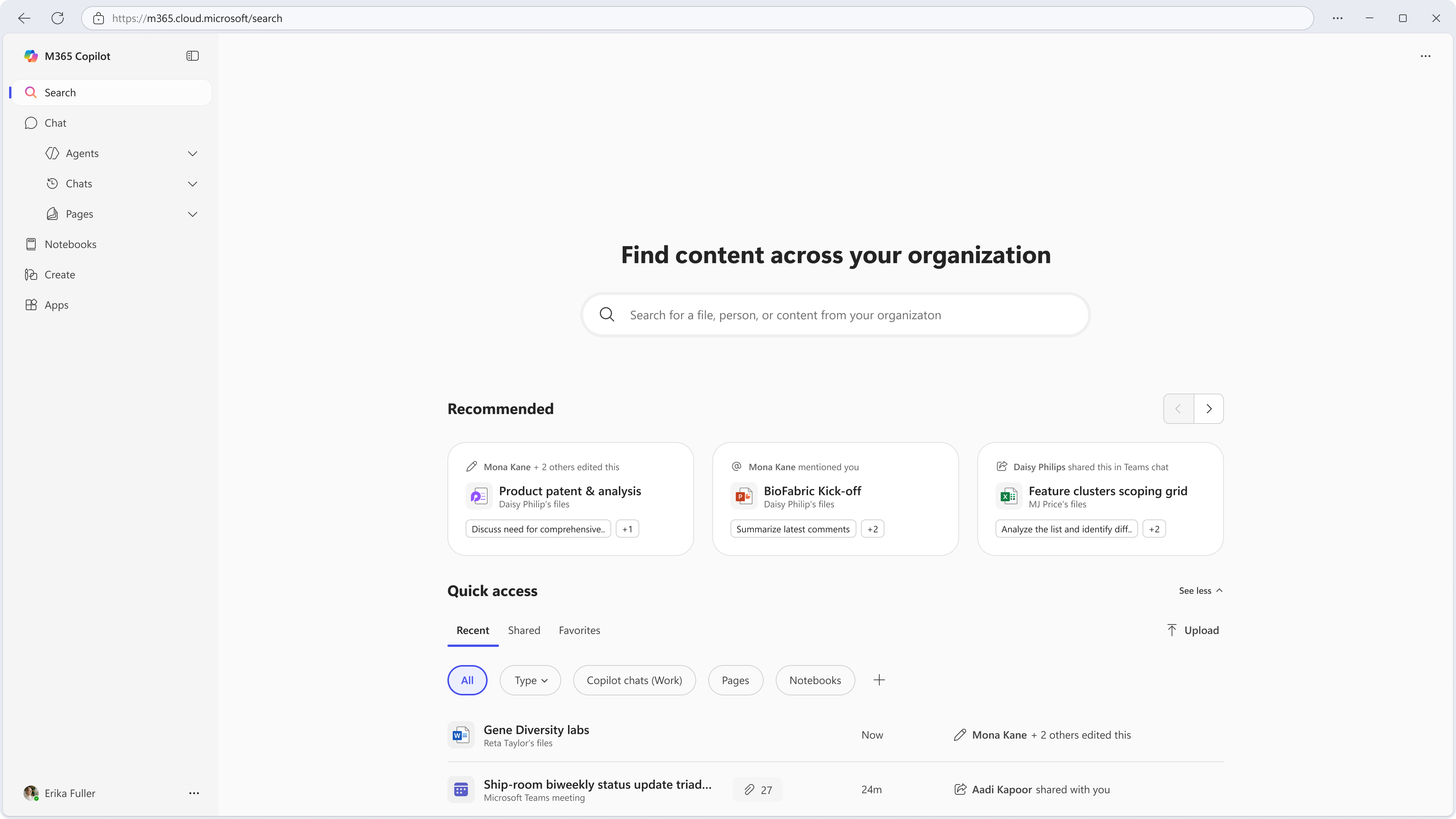 Was ist zu verwenden, wenn: Da es in Microsoft 365 Copilot integriert ist, können Benutzer die ergebnisse finden, die sie bei der Suche benötigen, und dann nahtlos in den Chat wechseln, um eine tiefere Untersuchung oder Nachverfolgung der Aufgabe zu ermöglichen.