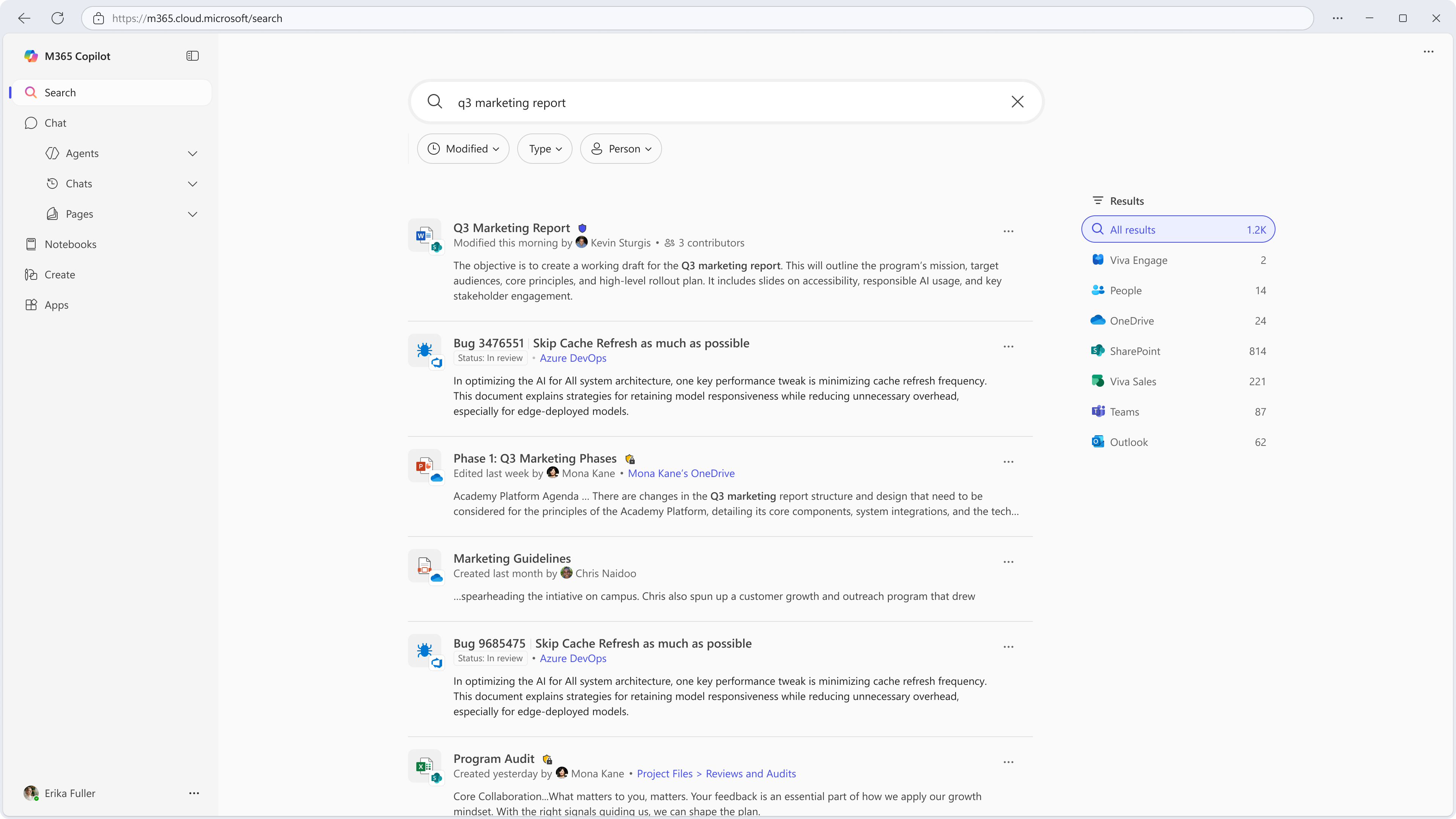Bei diesem Entwurf wird die Suche als Organisationsebene für KI positioniert, während der Chat der Arbeitsbereich für die Aufgabenausführung und tiefere Interaktionen bleibt. Wenn ein Benutzer beispielsweise nach dem status des Q2-Berichts sucht, gibt Copilot Search möglicherweise eine zusammengefasste Antwort zurück und bietet an, die Unterhaltung im Chat fortzusetzen, um differenziertere Erkundungs- oder Nachverfolgungsaktionen zu erhalten.