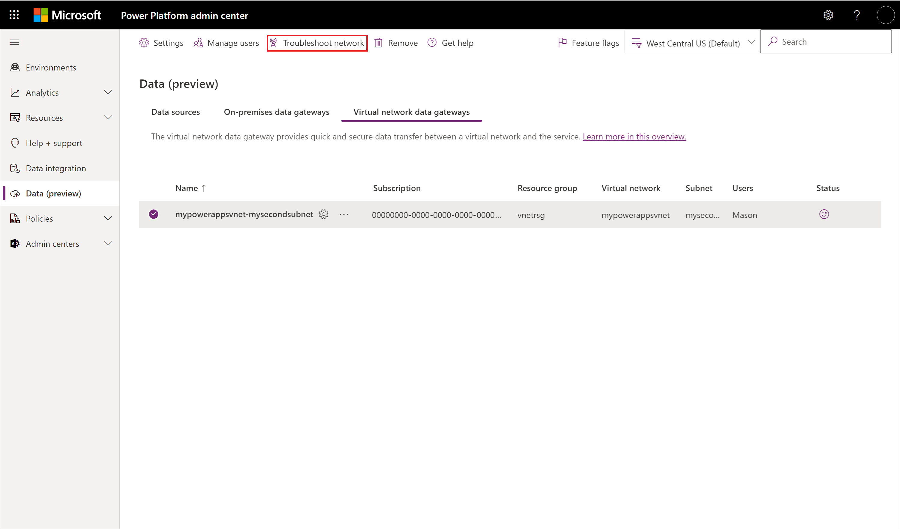 Wenn Probleme mit der Netzwerkkonnektivität zwischen dem Gateway und den erforderlichen Datenquellen auftreten, können Sie für das Netzwerkdatengateway Ihres virtuellen Netzwerks eine Problembehandlung durchführen.
