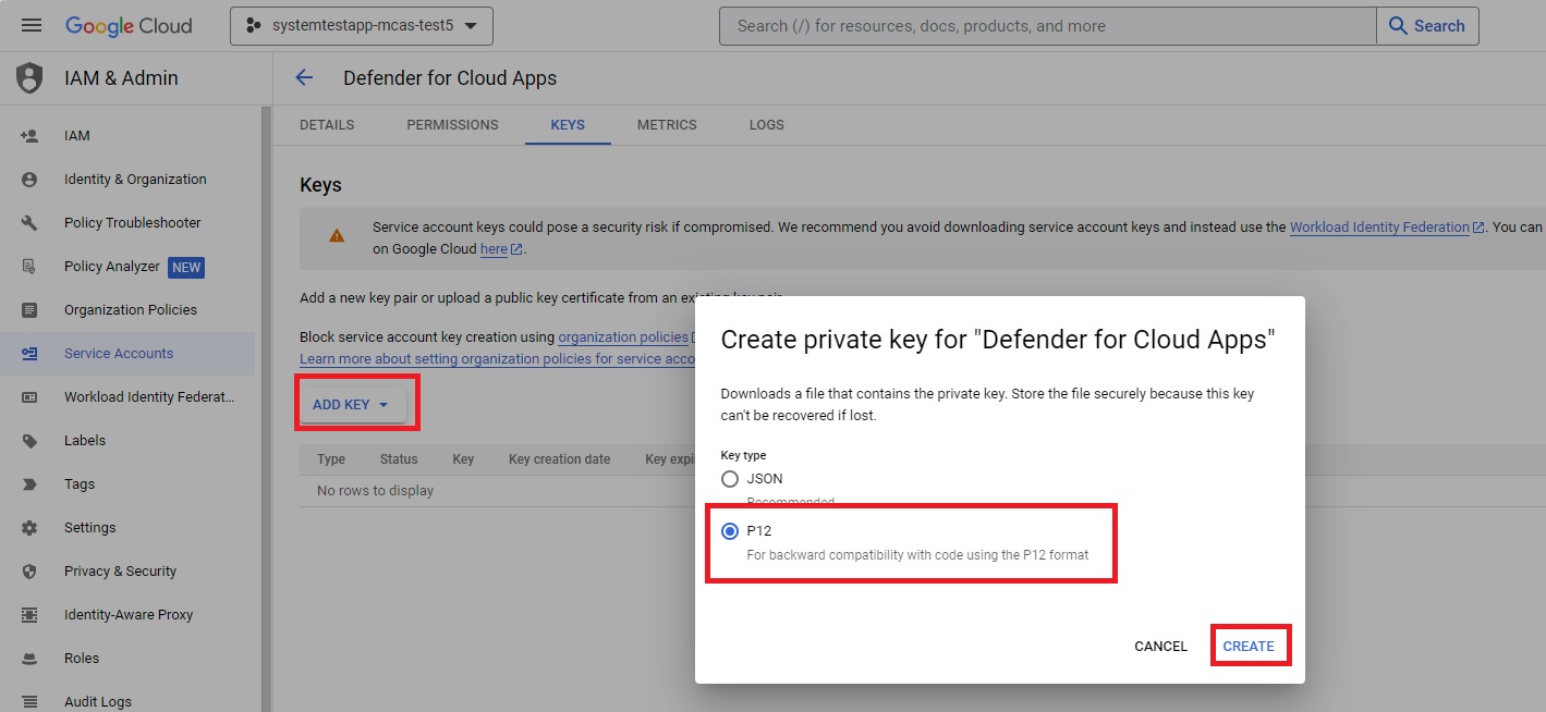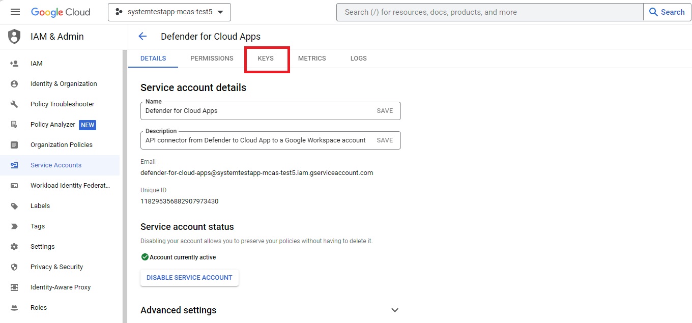 Dienstkontodetails: Geben Sie den Namen als Defender for Cloud Apps und eine Beschreibung als API-Connector aus Defender for Cloud Apps einem Google-Arbeitsbereichskonto an.