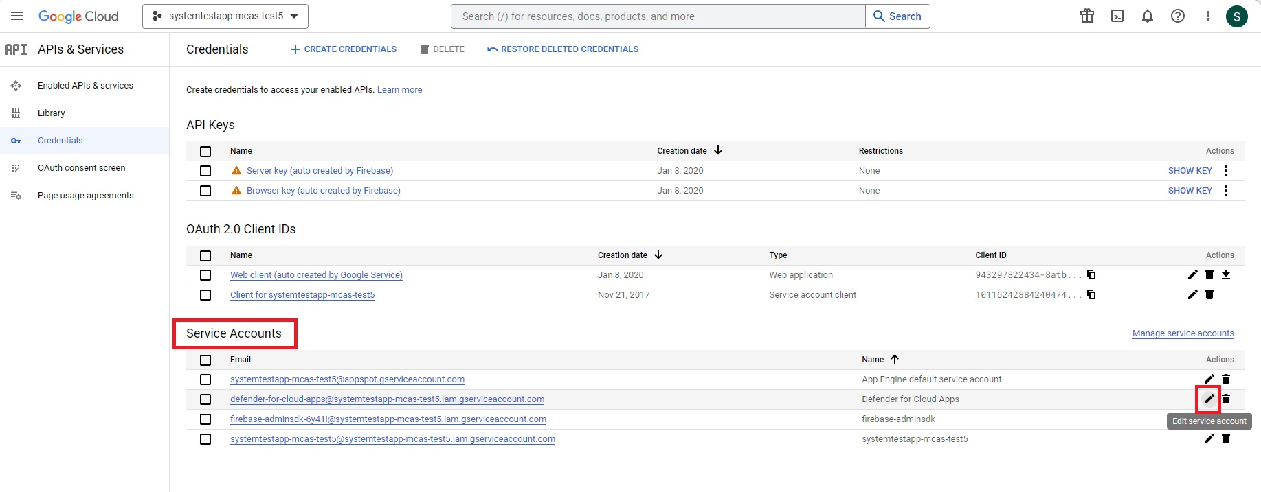 Suchen und bearbeiten Sie unter Dienstkonten das zuvor erstellte Dienstkonto, indem Sie auf das Stiftsymbol klicken.