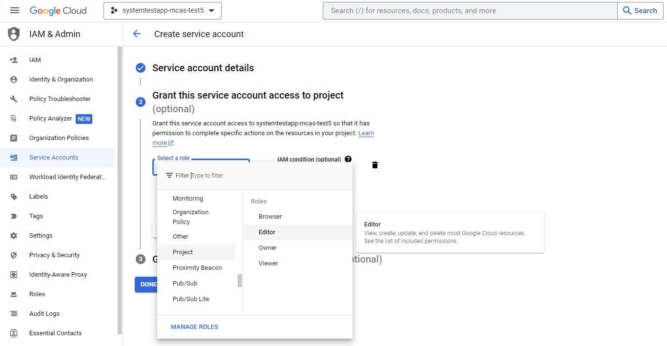 Wählen Sie unter Diesem Dienstkonto Zugriff auf das Projekt gewähren für Rolle die Option Projekt > Editor aus, und wählen Sie dann Fertig aus.
