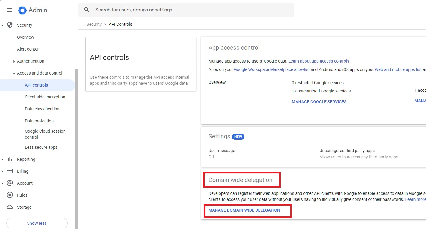 Wechseln Sie zu admin.google.com und im Navigationsmenü zu Sicherheitszugriff>undDatensteuerungs-API-Steuerelemente>. Gehen Sie dann wie folgt vor: