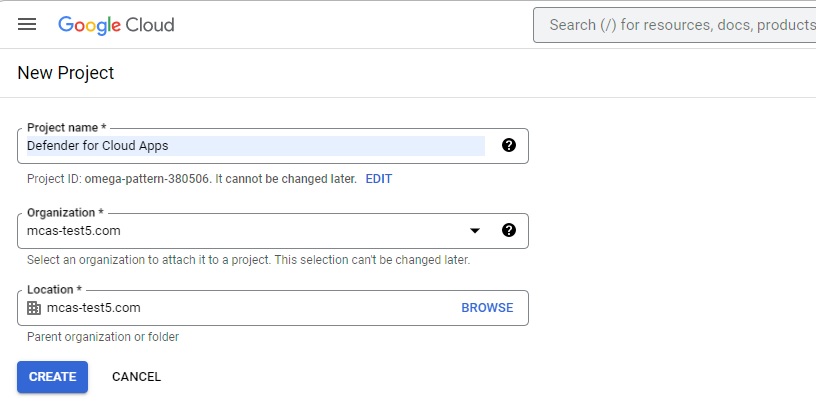 Benennen Sie Ihr Projekt auf der Seite Neues Projekt wie folgt: Defender for Cloud Apps, und wählen Sie Erstellen aus.