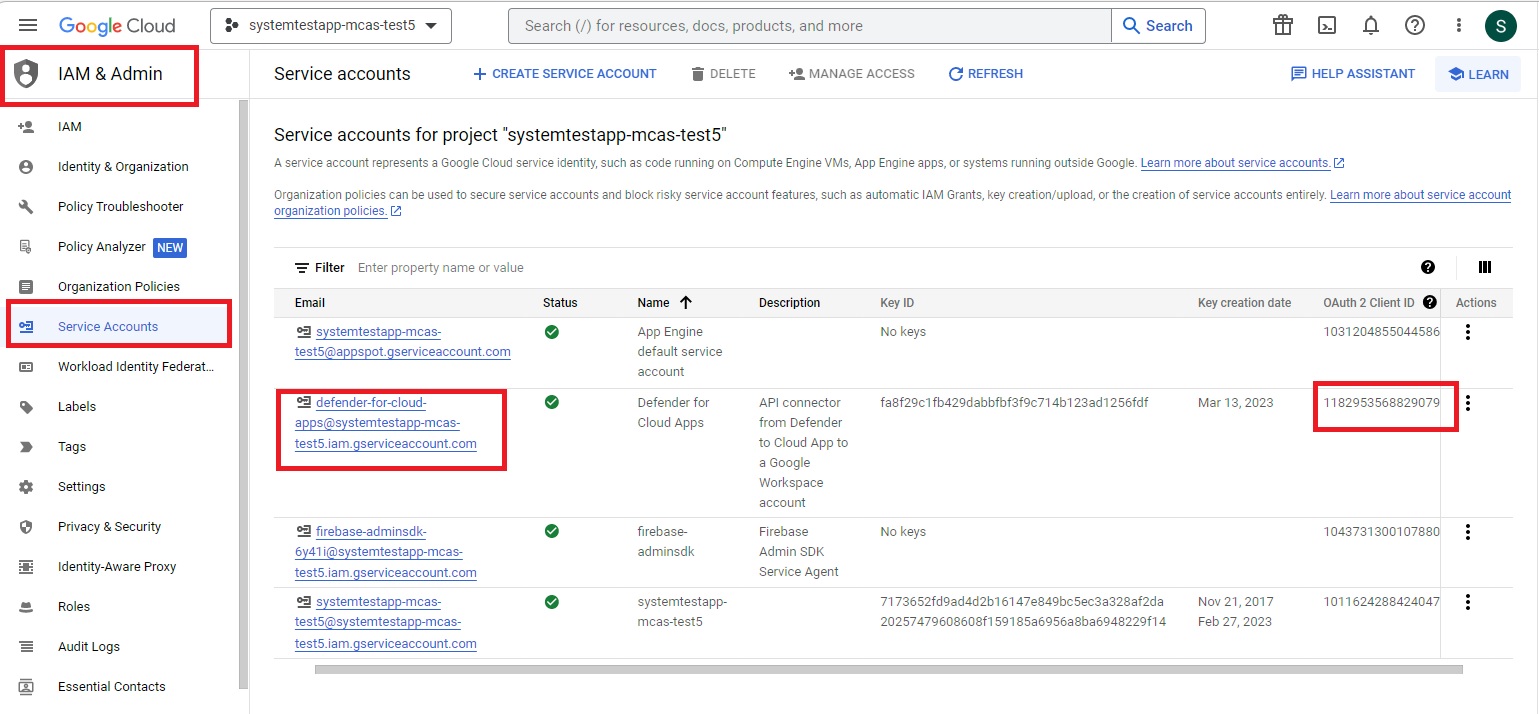 Navigieren Sie im Navigationsmenü zu IAM & Admin>Servicekonten. Kopieren Sie die Client-ID , die dem von Ihnen erstellten Dienstkonto zugewiesen ist. Sie benötigen sie später.
