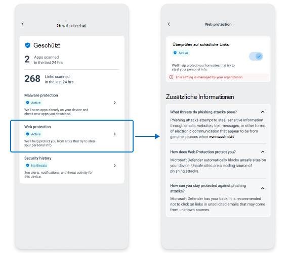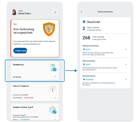 Die Features "App Security" und "Webschutz" sind jetzt unter einem einzigen Feature Karte geräteschutz konsolidiert. Bisher verfügte jede Funktionalität über eigene separate Karte auf dem Dashboardbildschirm. Die folgende Abbildung zeigt die neue Version des Device Protection-Features Karte.
