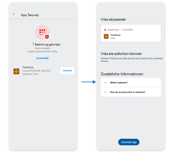 In der folgenden Abbildung wird das Feature "Bedrohung gefunden" hervorgehoben, das seine Funktionalität sowohl vor als auch nach dem letzten Update zeigt.