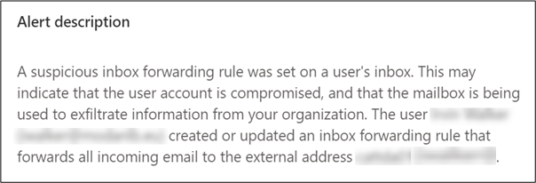 Verdächtige Posteingangsweiterleitungsregeln sind möglicherweise schwer zu erkennen, da die Wartung von Posteingangsregeln eine häufige Aufgabe von Benutzern ist. Daher ist es wichtig, die Warnungen zu überwachen.