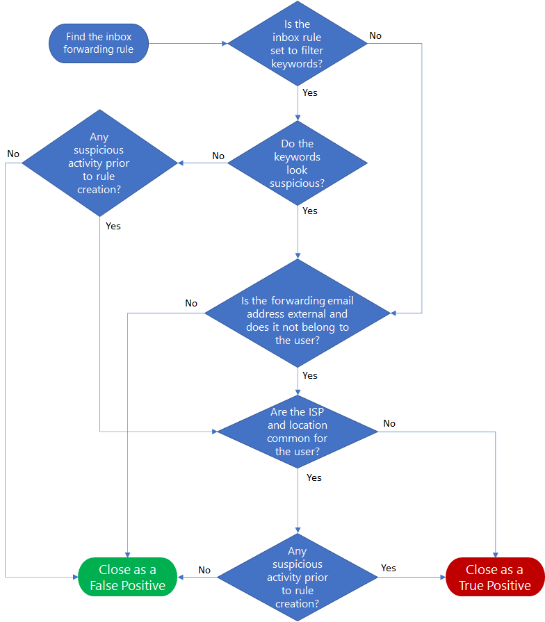 Bedrohungsakteure können kompromittierte Benutzerkonten für verschiedene böswillige Zwecke verwenden, z. B. für das Lesen von E-Mails im Posteingang eines Benutzers, das Erstellen von Posteingangsregeln zum Weiterleiten von E-Mails an externe Konten, das Senden von Phishing-Mails und andere. Böswillige Posteingangsregeln sind bei bedenklichen E-Mail-Kompromittierungen (Business Email Compromise, BEC) und Phishing-Kampagnen weit verbreitet, und es ist wichtig, sie konsistent zu überwachen. Dieses Playbook hilft Ihnen, Warnungen auf verdächtige Posteingangsweiterleitungsregeln zu untersuchen und sie schnell entweder als true positive (TP) oder false positive (FP) zu bewerten. Anschließend können Sie empfohlene Aktionen für die TP-Warnungen ergreifen, um den Angriff zu beheben.