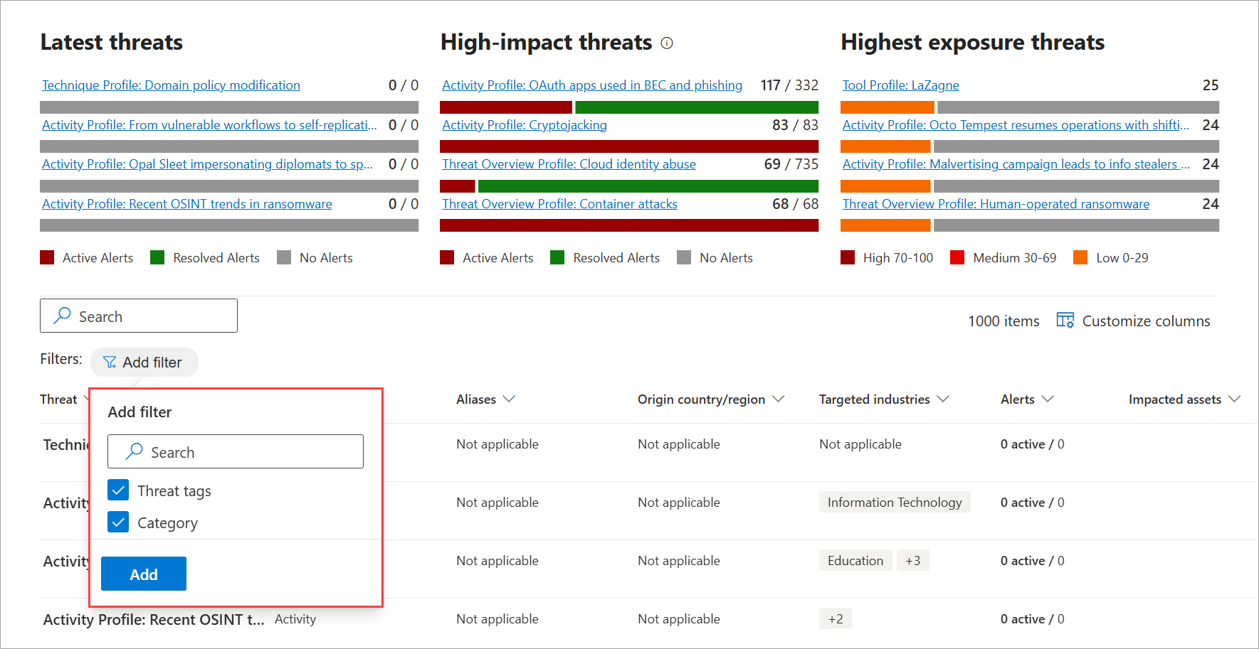 - Bedrohungen mit hohen Auswirkungen – listet die Bedrohungen auf, die die größten Auswirkungen auf Ihre organization haben. In diesem Abschnitt werden die Bedrohungen mit der höchsten Anzahl aktiver und behobener Warnungen zuerst aufgelistet.