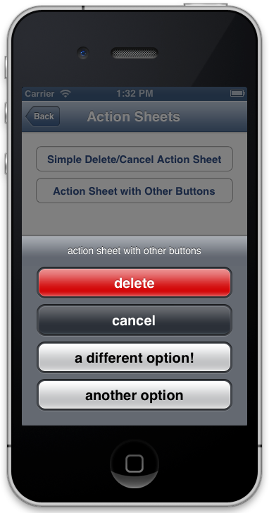 The UIActionSheet control is a convenient way to allow the application user to choose among alternative actions. The following code and diagram are taken from the "Action Sheets" section of the "iOS Standard Controls" sample.
