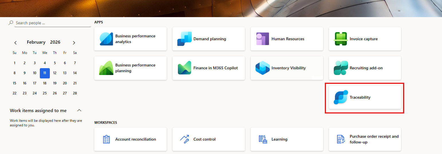Wenn Sie das Feature (Preview) Traceability in der Featureverwaltung aktivieren, fügt das System eine Traceability-Kachel im Abschnitt Apps auf der Home-Seite des Supply Chain Managements hinzu, wie in der folgenden Abbildung dargestellt. Um die Traceability-App zu öffnen, wählen Sie die Kachel aus.