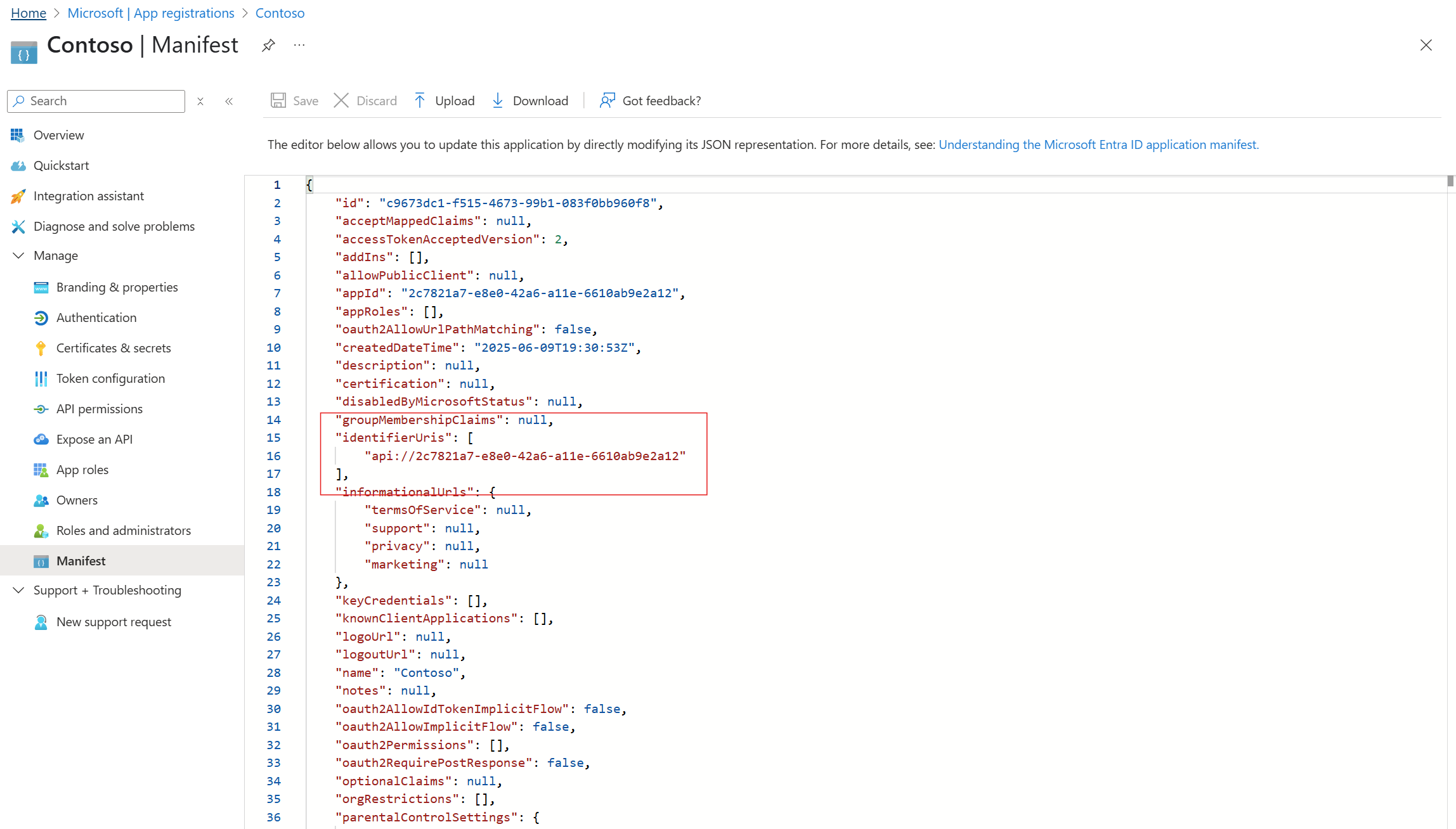api- oderhttpsURI-Schemas werden empfohlen. Legen Sie die Eigenschaft in den unterstützten Formaten fest, um URI-Konflikte in Ihrer Organisation zu vermeiden. Verwenden Sie keine Platzhalter. - Verwenden Sie eine überprüfte Domäne Ihrer Organisation.