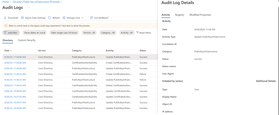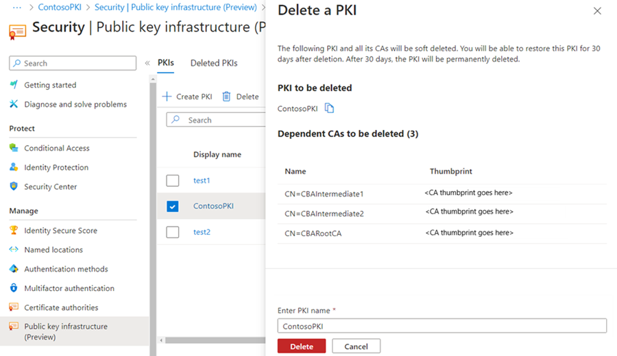 Microsoft Entra verfügt über einen neuen PKI-basierten Ca Trust Store. Der Vertrauensspeicher behält CAs innerhalb eines Containerobjekts für jede PKI bei. Administratoren können CAs in einem Container auf Basis von PKI einfacher verwalten, als eine flache Liste von CAs zu verwalten.
