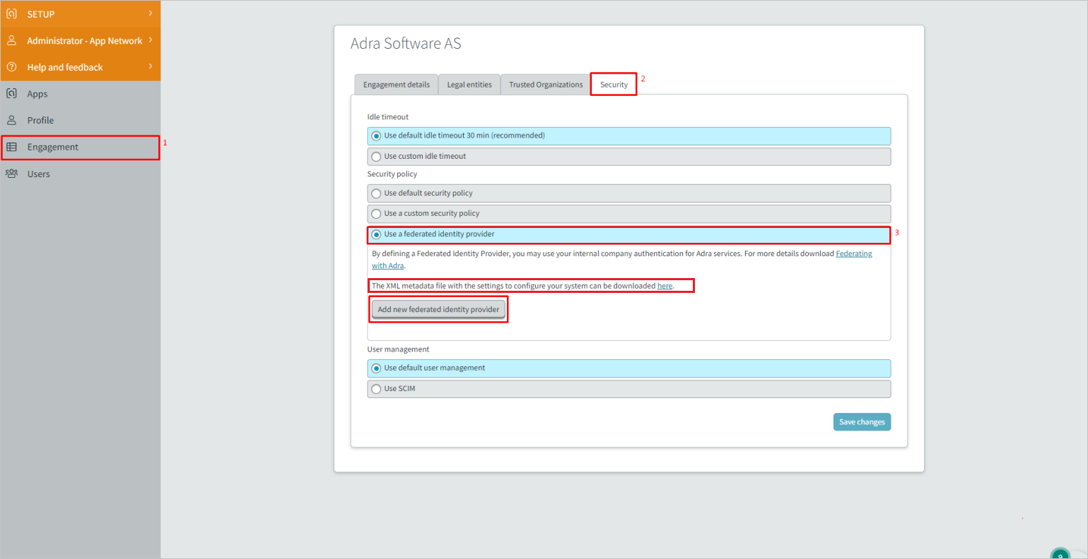 Wechseln Sie zum Engagement>Sicherheits-Tab >Sicherheitsrichtlinie> und wählen Sie die Schaltfläche "Verbundidentitätsanbieter verwenden" aus.
