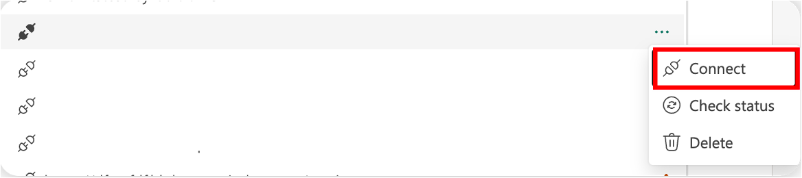 Im Laufe der Zeit kann sich der Status einer Fabric-Verbindung aufgrund verschiedener Gründe ändern, z. B. Ablauf der Anmeldeinformationen oder Berechtigungsänderungen. Sie können den Verbindungsstatus überprüfen, indem Sie im Kontextmenü die Schaltfläche "Status überprüfen" auswählen.