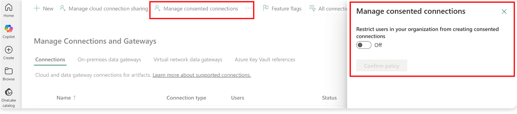 Es gibt eine Einstellung auf Mandantenebene, mit der der Mandantenadministrator steuern kann, ob dieses Feature für den gesamten Mandanten aktiviert ist. Wenn die Einstellung deaktiviert ist, können Benutzer Fabric-Verbindung nicht in Notizbüchern verwenden. Dieses Feature ist standardmäßig aktiviert.