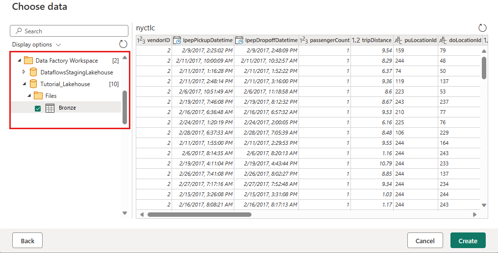Das Dialogfeld " Daten auswählen " wird angezeigt. Verwenden Sie den Navigationsbereich, um das Lakehouse zu finden, das Sie für das Ziel im vorherigen Modul erstellt haben. Möglicherweise befindet es sich unter dem Ordner "Mein Arbeitsbereich ". Wählen Sie die Bronze-Datentabelle aus. Wählen Sie dann Erstellen aus.