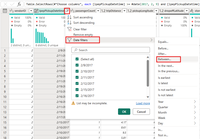 Wählen Sie in der Dropdownliste der Spalte IpepPickupDatetime Sortieren und Filtern aus, dann Datumsfilter, und wählen Sie den Filter Zwischen... aus, der für Datums- und Datums-/Uhrzeittypen verfügbar ist.