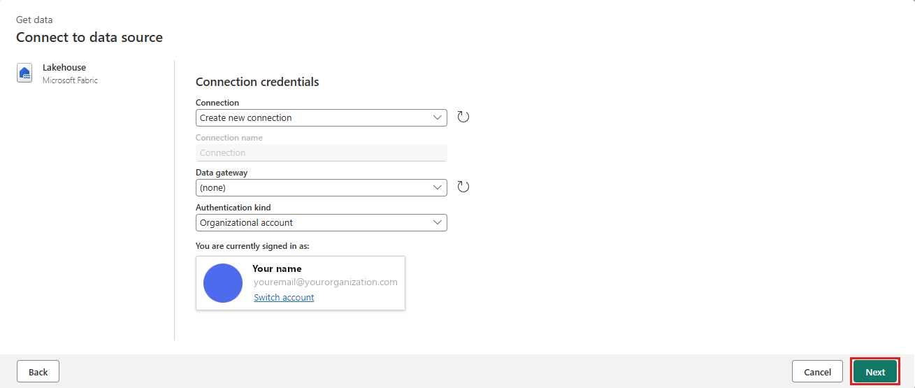Das Dialogfeld "Mit Datenquelle verbinden " wird angezeigt, und basierend auf dem aktuell angemeldeten Benutzer wird automatisch eine neue Verbindung für Sie erstellt. Wählen Sie Weiteraus.