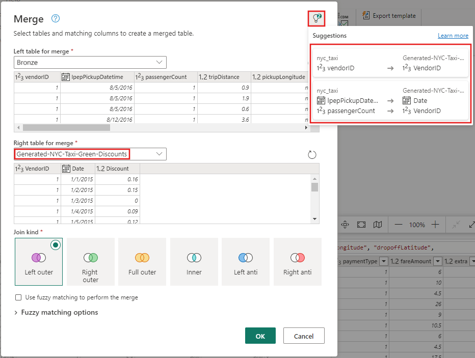 Wählen Sie im Zusammenführen-Dialog einen linken äußeren Join aus, und wählen Sie dann Generated-NYC-Taxi-Green-Discounts aus der Dropdownliste Rechte Tabelle für die Zusammenführung aus, und wählen Sie oben rechts im Dialog das Symbol für "Tipps" aus, um die vorgeschlagene Zuordnung der Spalten zwischen den beiden Tabellen anzuzeigen.