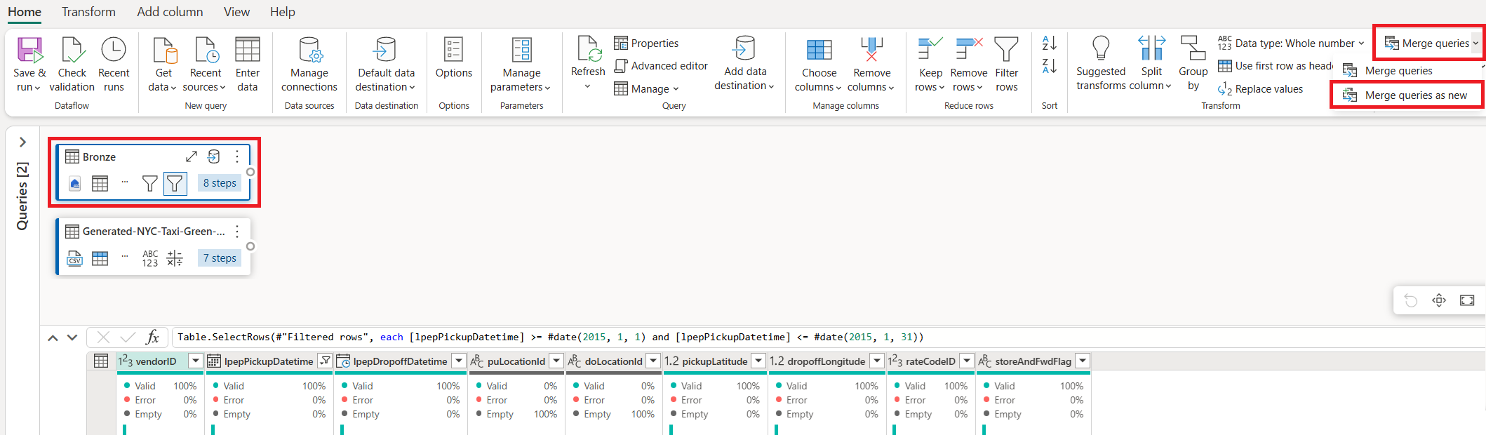 Wählen Sie Ihre ursprüngliche Datenabfrage (in unserem Beispiel als Bronze bezeichnet) aus, und wählen Sie auf der Registerkarte Startseite im Menü Kombinieren die Option Abfragen zusammenführen und dann Abfragen als neue zusammenführen.
