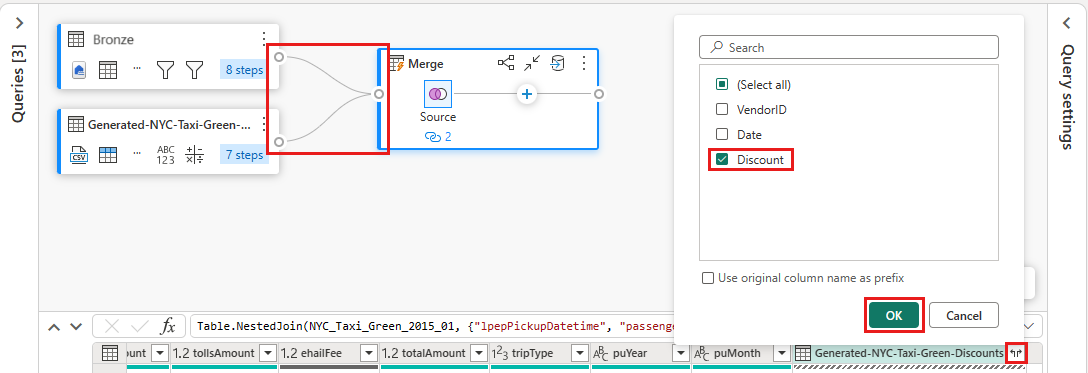 Beachten Sie, wie eine neue Abfrage in der Diagrammansicht erstellt wurde, die die Beziehung der neuen Zusammenführungsabfrage mit den beiden zuvor erstellten Abfragen anzeigt. Wenn Sie sich den Tabellenbereich des Editors ansehen, scrollen Sie nach rechts neben der Listenliste der Zusammenführungsabfrage, um eine neue Spalte mit Tabellenwerten anzuzeigen. Dies ist die Spalte "Generierte NYC Taxi-Green-Discounts", und der Typ ist [Tabelle]. In der Spaltenüberschrift gibt es ein Symbol mit zwei Pfeilen in entgegengesetzter Richtung, sodass Sie Spalten aus der Tabelle auswählen können. Deaktivieren Sie alle Spalten mit Ausnahme von Rabatt, und wählen Sie dann OK aus.