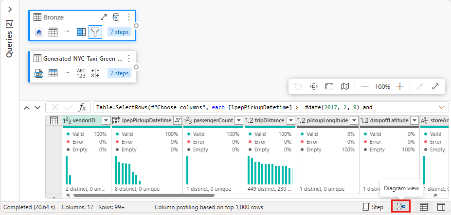 Wählen Sie das Datentypsymbol in der Spaltenüberschrift der zweiten Spalte, IpepPickupDatetime, aus, um ein Dropdownlistenmenü anzuzeigen, und wählen Sie den Datentyp aus dem Menü aus, um die Spalte aus dem Datums-/Uhrzeit-Typzu konvertieren.
