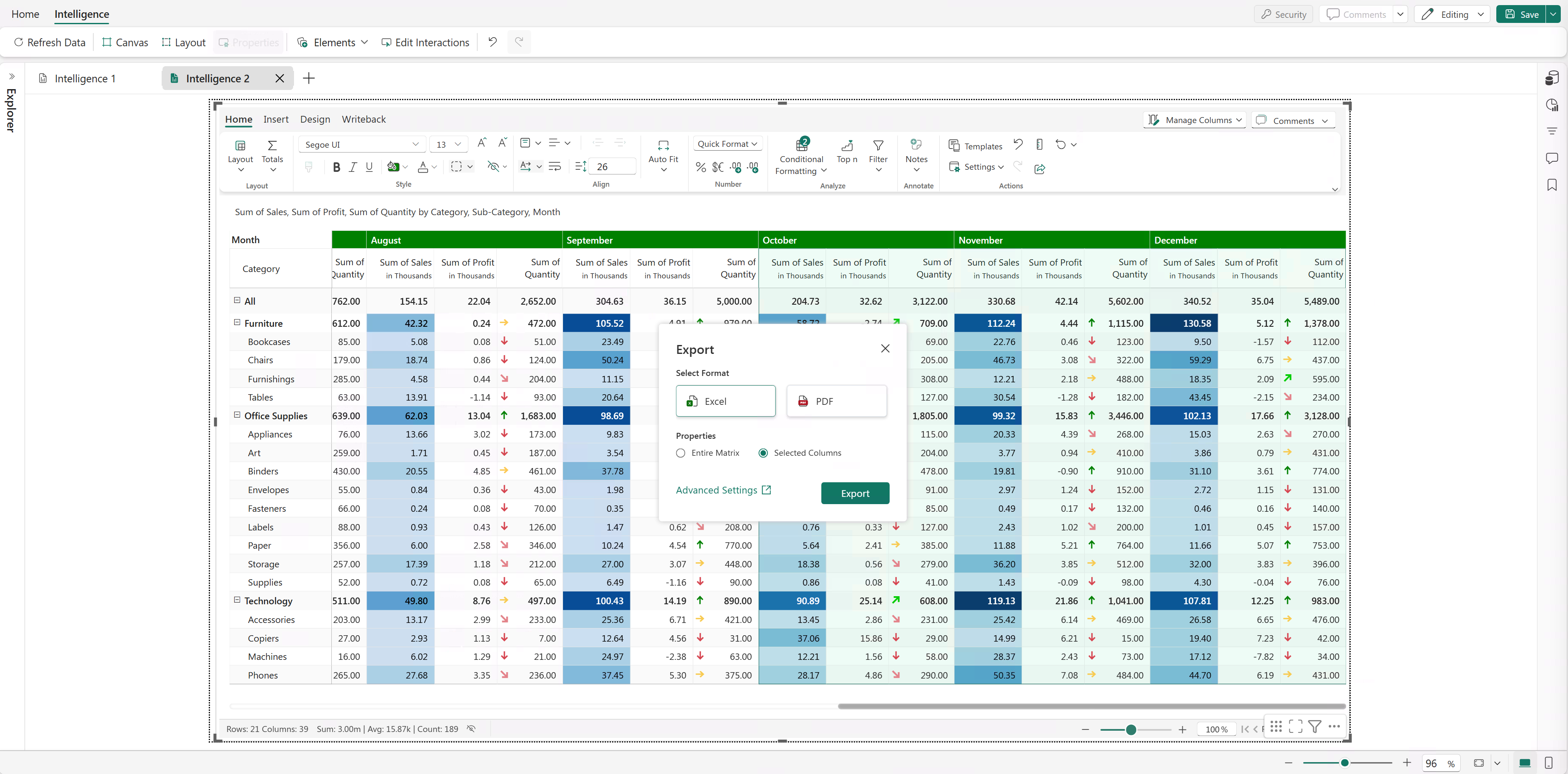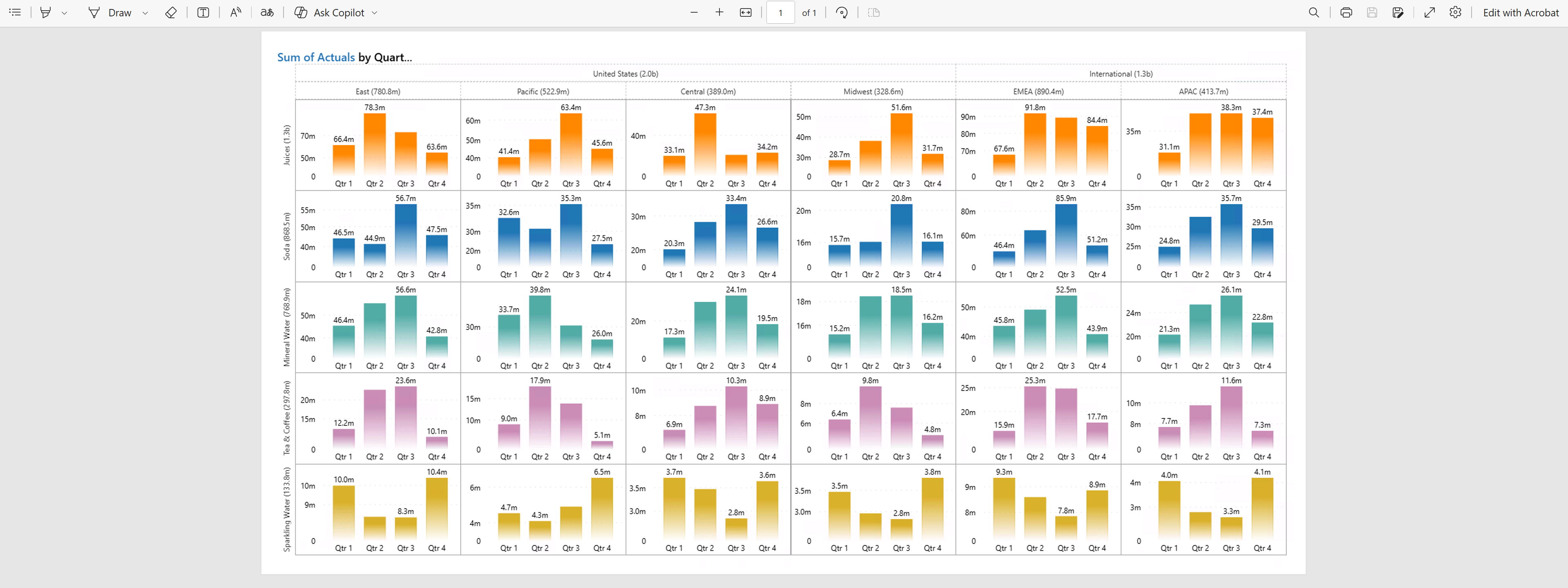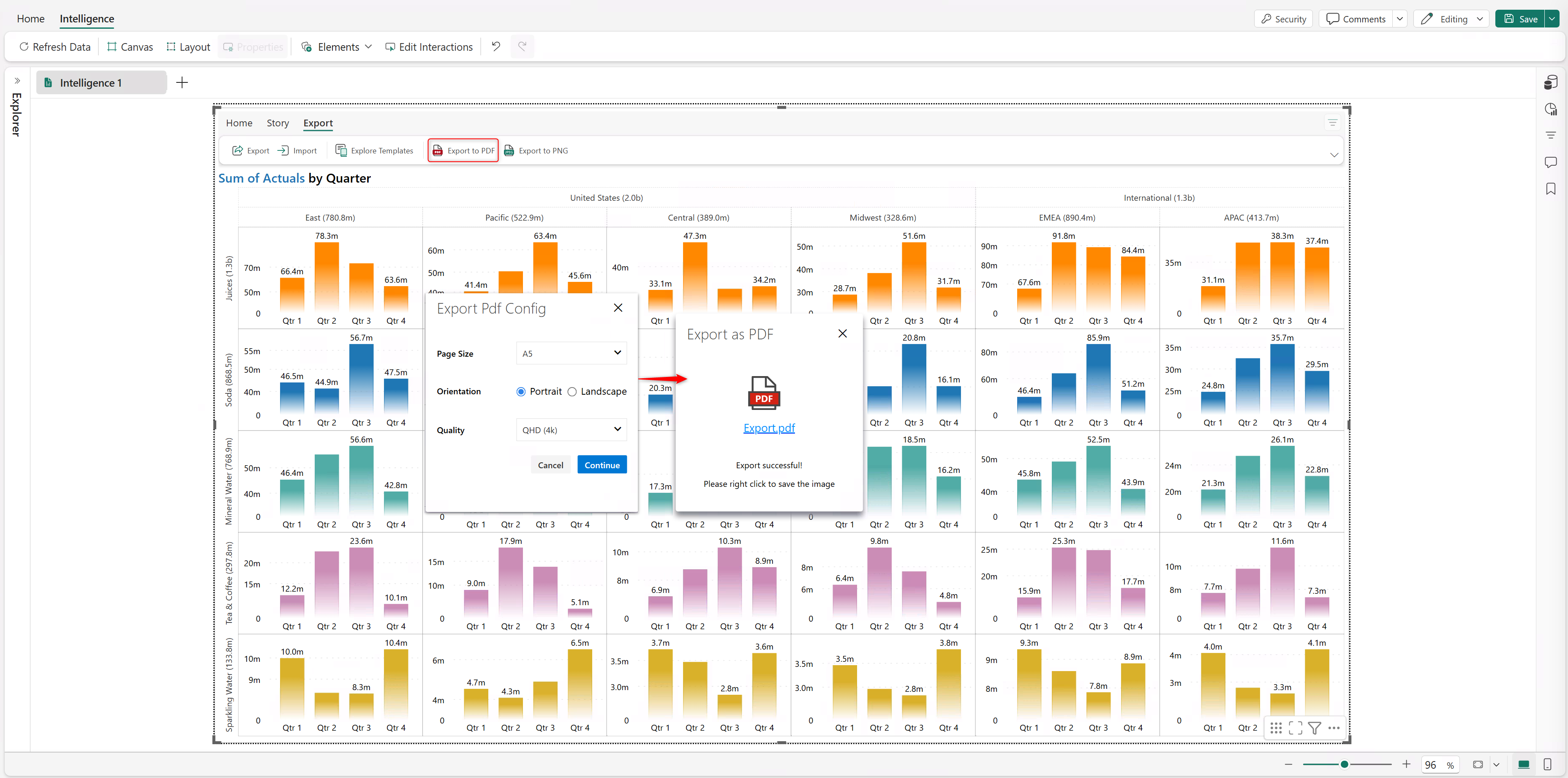 Exportieren Sie Berichte und Dashboards als qualitativ hochwertige Dateien, wobei Layout und Formatierung beibehalten werden. Exportoptionen ermöglichen Folgendes: