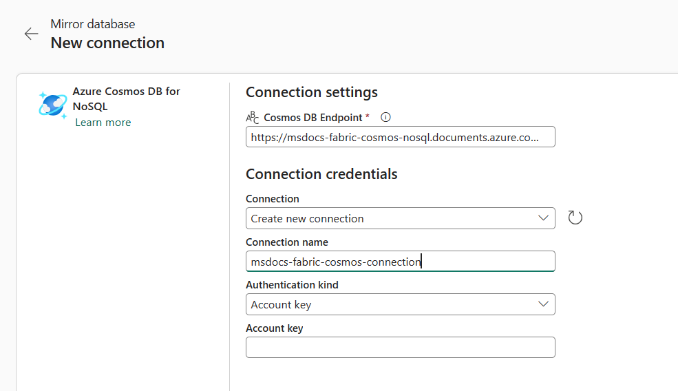 Geben Sie Anmeldeinformationen für das Azure Cosmos DB für NoSQL-Konto an, einschließlich der folgenden Elemente: