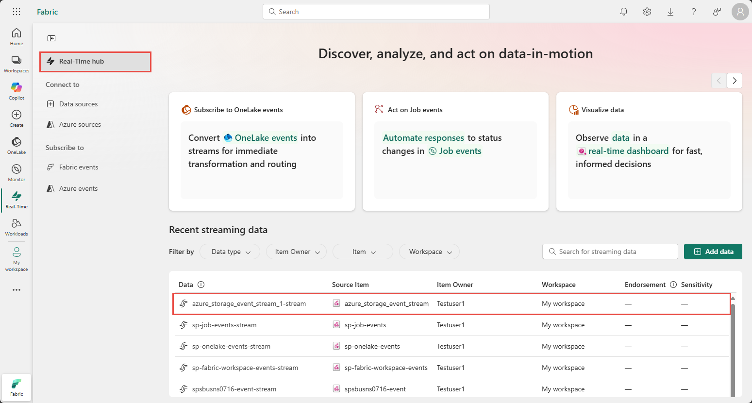 Wählen Sie Real-Time Hub im linken Navigationsmenü aus, und bestätigen Sie, dass der von Ihnen erstellte Stream angezeigt wird. Falls Sie es nicht sehen, aktualisieren Sie die Seite.