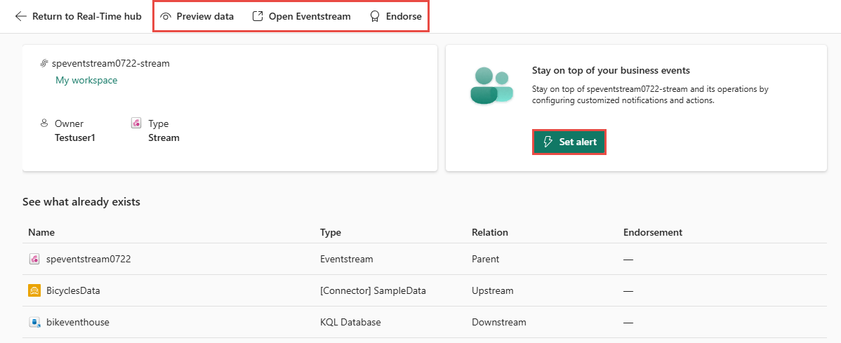 | Endorse | Empfehlen Sie den übergeordneten Eventstream des Streams. Weitere Informationen finden Sie unter Unterstützen von Streams. |