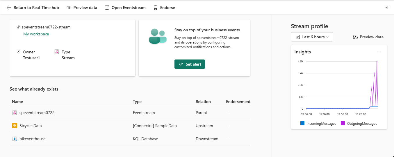 | Benachrichtigung festlegen | Der Eventstream verfügt über eine Datenstromausgabe, für die Sie Warnungen festlegen können. Weitere Informationen finden Sie unter Festlegen von Warnungen für Datenströme im Echtzeithub. |