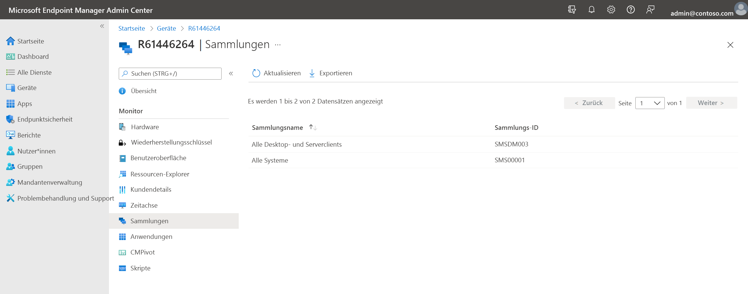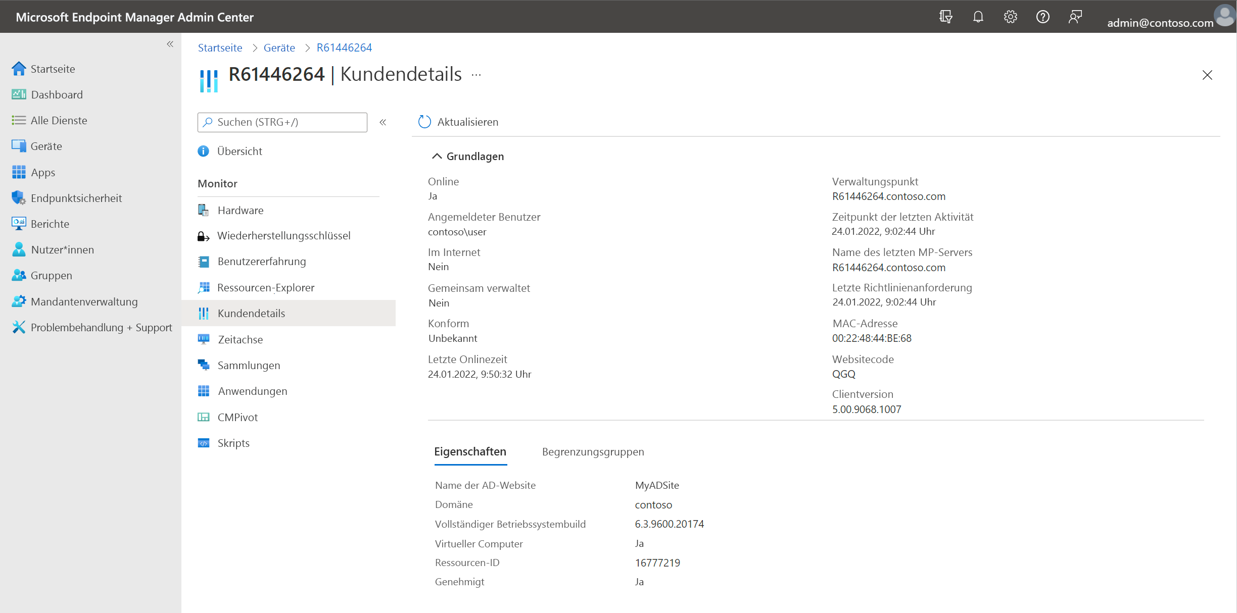 Die Microsoft Intune Produktfamilie ist eine integrierte Lösung für die Verwaltung all Ihrer Geräte. Microsoft vereint Configuration Manager und Intune in einer einzigen Konsole namens Microsoft Intune Admin Center. Im Admin Center können Sie Configuration Manager-Clientdetails anzeigen wie z. B. Sammlungen, die Zugehörigkeit zu Begrenzungsgruppen und Clientinformationen in Echtzeit für ein bestimmtes Gerät.