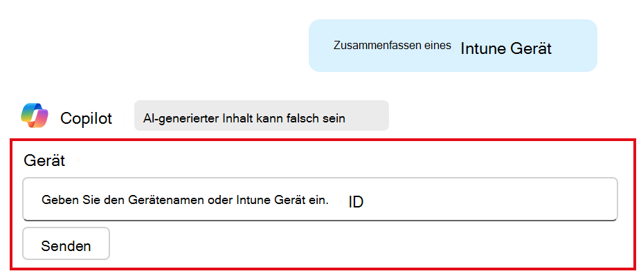 Wenn eine Eingabeaufforderung weitere Informationen erfordert, werden Sie aufgefordert, diese Informationen einzugeben. Wenn Sie beispielsweise den Vorschlag Zusammenfassen eines Intune Geräts auswählen, werden Sie aufgefordert, die Geräte-ID einzugeben: