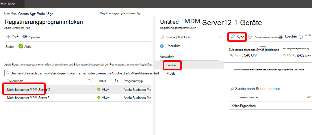 - Apple Business Manager und Apple School Manager synchronisieren etwa 3.000 Geräte pro Minute mit Intune. Es wird empfohlen, die manuelle Synchronisierung aus dem Admin Center wieder zurückzuhalten, bis genügend Zeit verstreicht, bis die Synchronisierung aller Geräte abgeschlossen ist (Gesamtanzahl der Geräte/3.000 Geräte pro Minute).