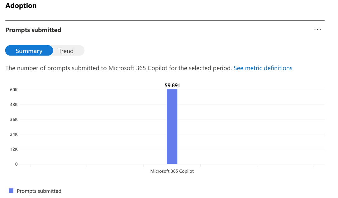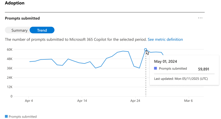 Die Trendansicht zeigt den täglichen Trend von Eingabeaufforderungen an, die in Microsoft 365 Copilot über den ausgewählten Zeitraum übermittelt wurden.