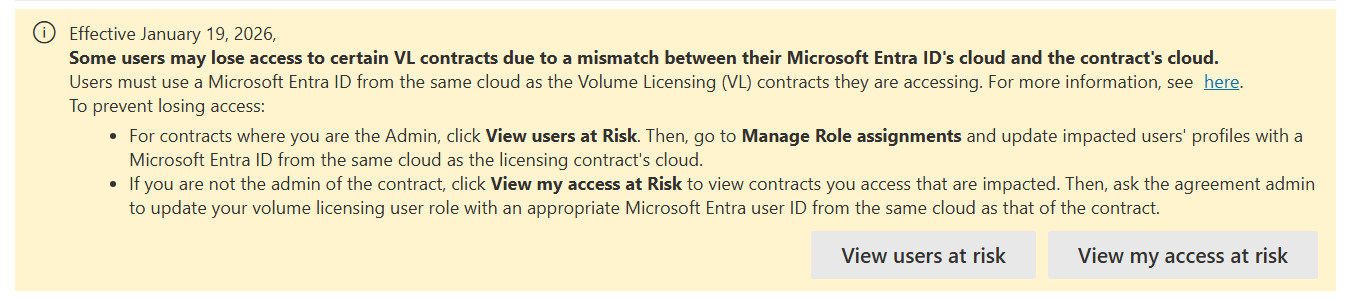 - Oben auf der Seite Verträge wird ein Banner mit der Meldung angezeigt: "Einige Benutzer verlieren möglicherweise den Zugriff auf bestimmte VL-Verträge aufgrund eines Konflikts zwischen der Cloud ihrer Microsoft Entra ID und der Cloud des Vertrags." Wählen Sie Meinen gefährdeten Zugriff anzeigen aus.