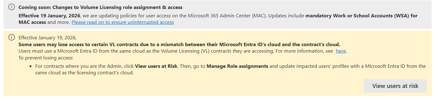 - Wenn Sie sich beim Microsoft 365 Admin Center anmelden, wird ein Banner mit der Meldung "Einige Benutzer verlieren möglicherweise den Zugriff auf bestimmte VL-Verträge aufgrund eines Konflikts zwischen der Cloud des Microsoft Entra ID und der Cloud des Vertrags", wie im folgenden Screenshot gezeigt:
